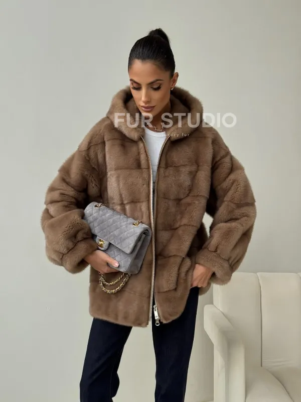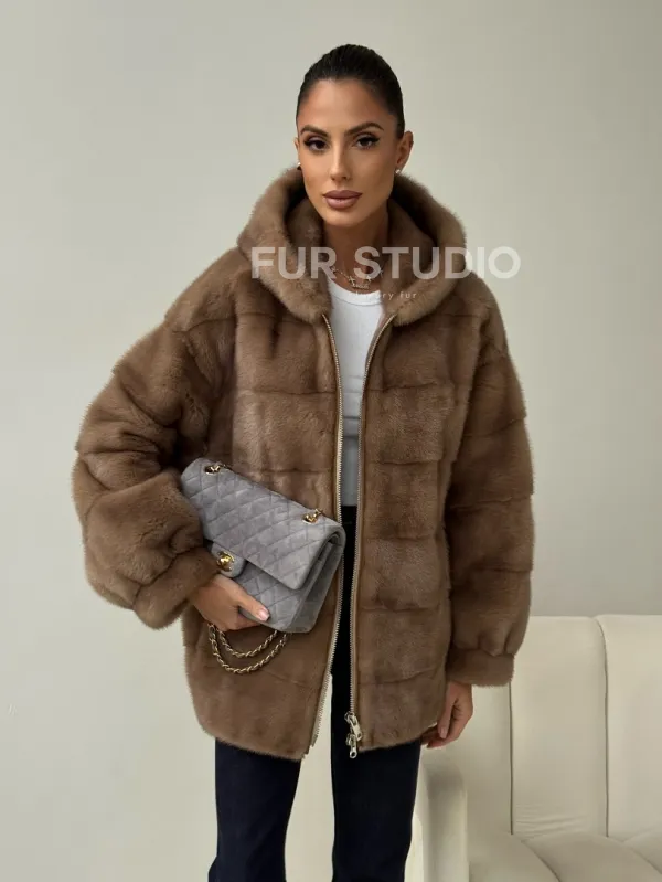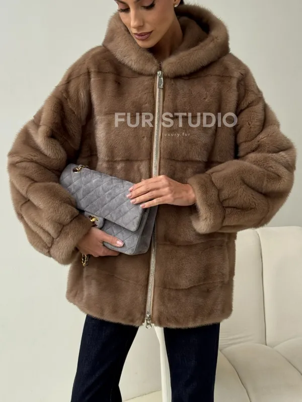 Бежевая норковая куртка с капюшоном 102430