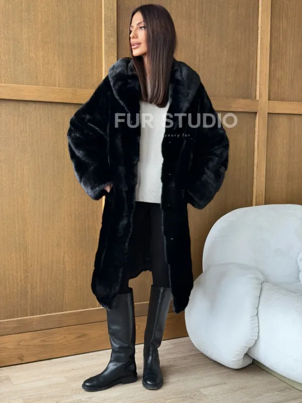 Черная норковая шуба с капюшоном 102765